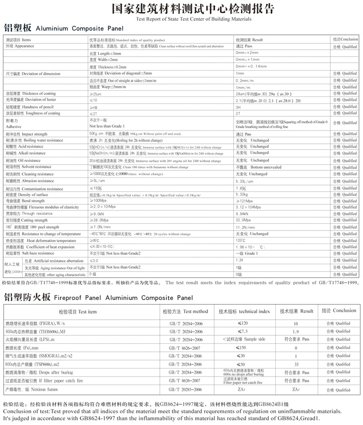百美牌鋁塑板采用西南鋁3000、5000系列,齊魯石化專用塑料,美國DUPONP高分子膜,美國PPG70%以上氟碳含量涂料生產(chǎn)復合而成,年產(chǎn)量400萬m2。