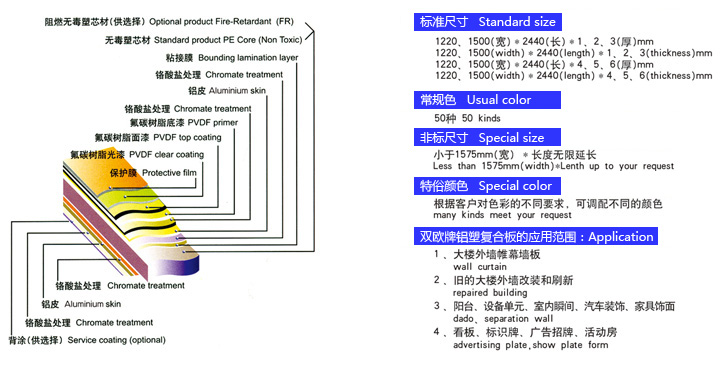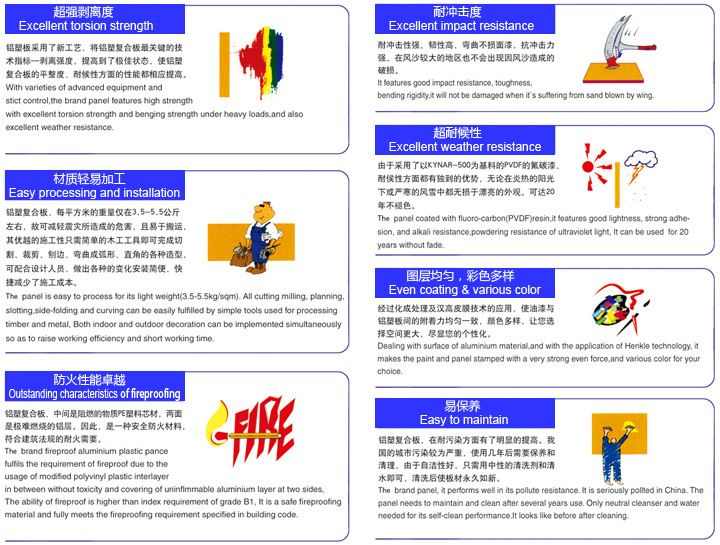 氟碳膜鋁塑板,采用德國氟碳膜工藝,提供二十年耐候質(zhì)保。尤其對原有熱轉(zhuǎn)印和花色輥涂不耐候的缺點作了全面的質(zhì)量保證,對于崗紋顏色和木紋顏色和其他多色涂裝的鋁塑板,用在外墻裝飾質(zhì)量更加優(yōu)越可靠。